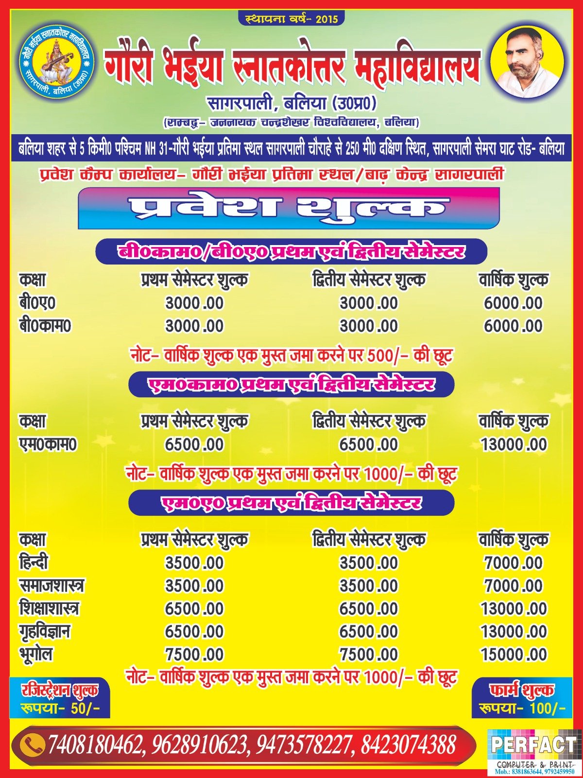 CONTACT US TODAYइस महाविद्यालय का निर्माण स्व० भैया गौरी शंकर सिंह ( गौरी भैया ) के द्वारा किये गये सामाजिक कार्यो को आगे बढ़ाते रहने के लिए माननीय नीरज शेखर सिंह के संरक्षण में कराया गया | यह महाविद्यालय आदर्श नगर सागर पाली बलिया में स्थित हैं | गौरी भैया स्नातकोत्तर महाविद्यालय परिवार आपका हार्दिक स्वागत करता हैं | इस परिवार का प्रत्येक सदस्य संस्था के आदर्श के परिपालन हेतु बचन बद्ध हैं, आप एक ऐसी संस्था से जुड़ने जा रहे हैं जिसके पास सांस्कृतिक मूल्यों को समझने एवं आधुनिक परिवेश को परखने की परम्परा हैं | संस्था को अपनी उपादेयता एवं उपलब्धि को आलोकित करने तथा सभासता एवं एकरूपता को स्थापित करने की परम्परा रही हैं | हमारा सतत एवं भागीरथ प्रयास हैं कि आपको अपने लक्ष्य तक इस संस्था के सुव्यवस्थित मूल्यों के द्वारा पंहुचा सके एवं आपको संस्कारयुक्त व्यक्तित्व दे सकें, जिससे राष्ट्र की उत्तरोत्तर प्रगति में आप एक महत्वपूर्ण प्रकार प्रकाश स्तम्भ बनकर लोगों का मार्ग प्रशस्त कर सकें |